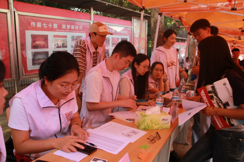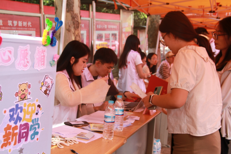 在迎新现场,陆续到达的新同学们受到学长学姐们的热情迎接,感受到学院大家庭的温暖。迎新现场,虽然已是9月,但天气依旧炎热,而志愿者们不惧炎热的天气,有条不紊地帮助新生办理入学手续。他们有的在迎新点处统计基本信息、发放新生礼包,有的帮助新生将行李运往宿舍,用心周到的服务让新同学们倍感亲切。学院特意为新生准备了“时光邮筒”“心愿箱”,引导新同学在迎新现场写下自己的美好心愿。另外,迎新点附近的展板则为新生们详细地介绍了宝宝计划概况