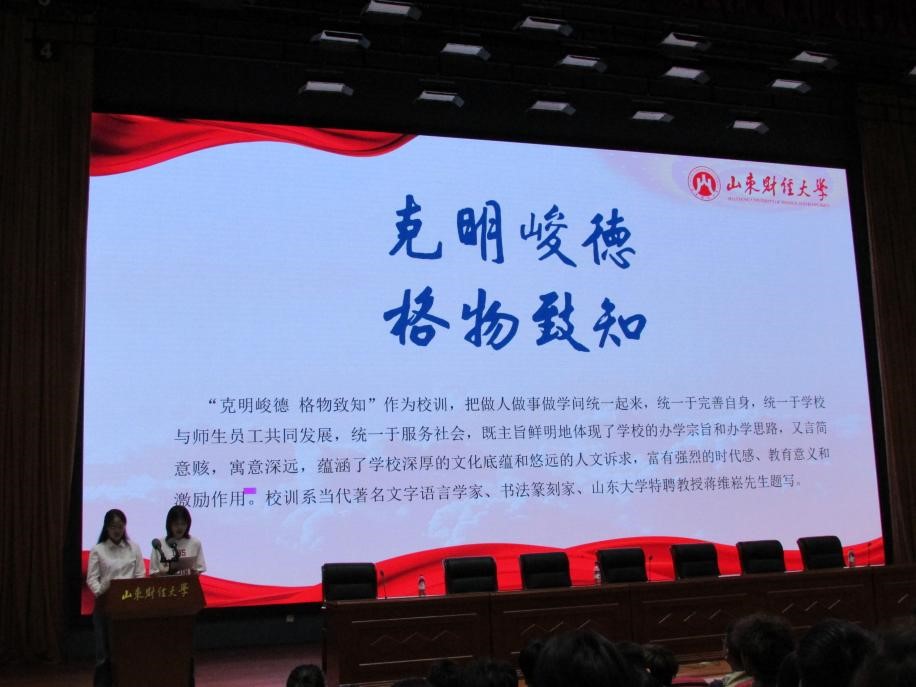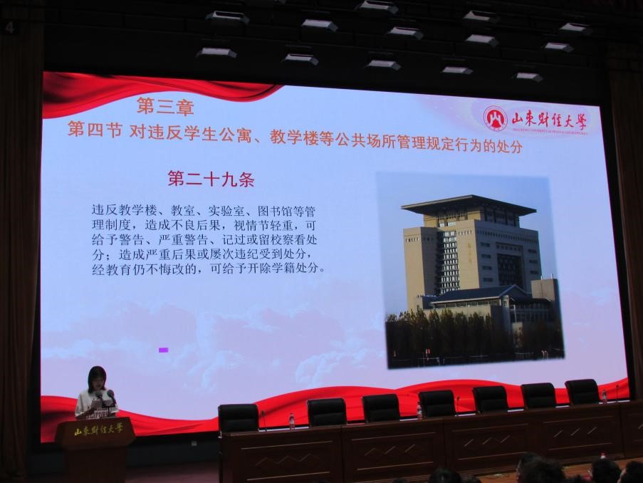 主讲人介绍了《山东财经大学学生违纪处分条例》中总则、处分的种类与适用范围、违纪行为与处分、处分权限和程序、附则五个部分。并结合案例详细解读了学校的相关规定、校园秩序准则、公寓管理条例、学习学术规范等内容。