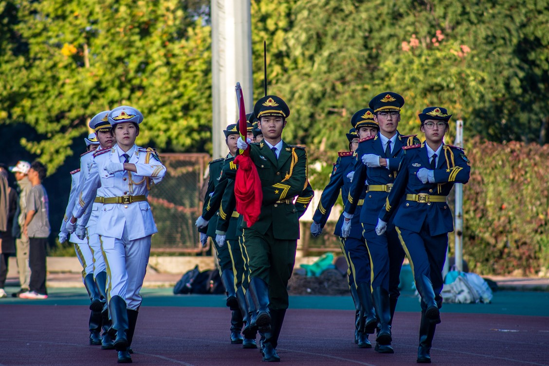 清晨七时整,升国旗仪式正式开始。国旗仪仗队的同学们迈着整齐划一、铿锵有力的步伐,护送着五星红旗走向旗杆。全体师生共唱国歌,注视着五星红旗冉冉升起,在熠熠晨光中迎风飘扬。