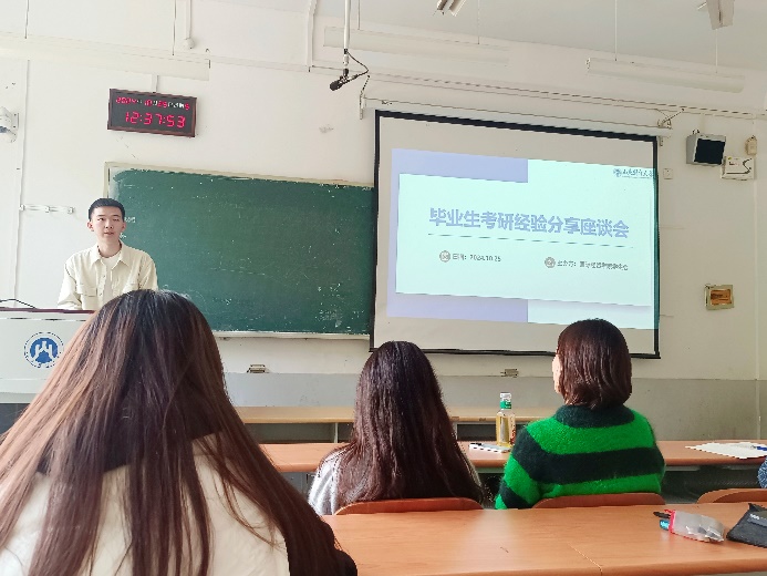 朱宝颖老师和段国蕊老师先后就考研准备流程、考研相关政策进行了解读。朱宝颖老师提出需要关注本校研究生招生信息网,及时同步本校发布的通知,在规定时间内进行网上报名,了解报考程序,提供准确材料。