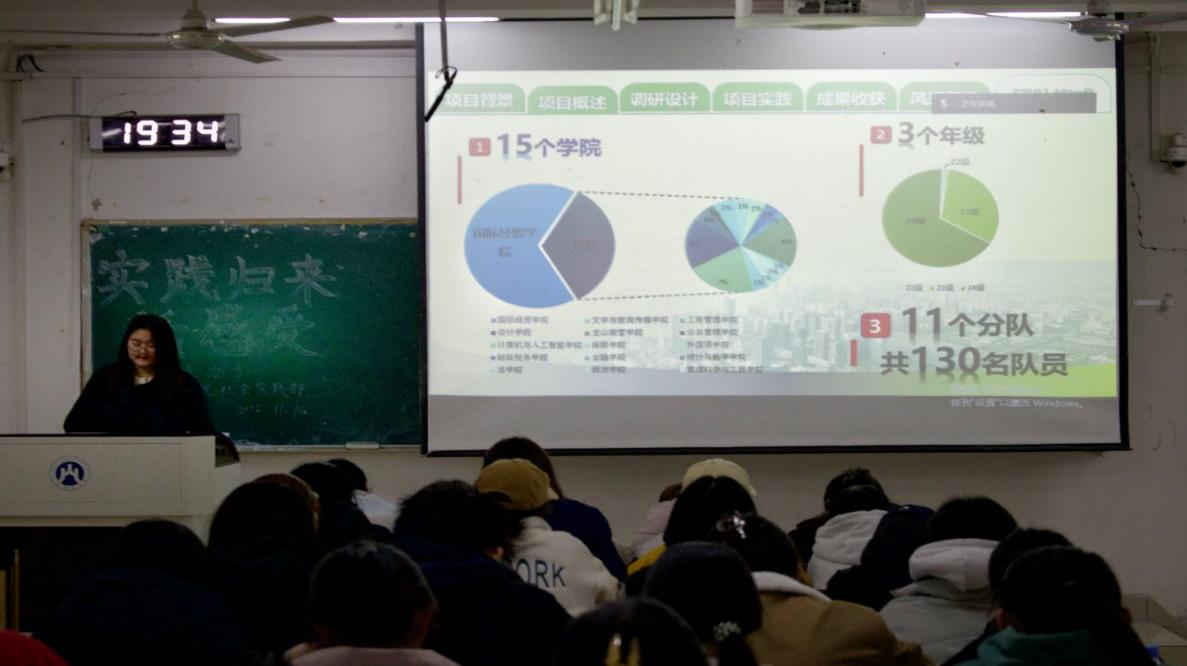“习近平生态文明思想引领制造企业绿色低碳高质量发展团队”队长孙梦洁,详细介绍了团队的项目背景、团队构成、调研地点、核心内容及实践流程,分享了在企业走访、数据采集过程中的宝贵经验,并分享了精心制作的团队宣传片。片中丰硕的调研成果与昂扬的团队风采,为同学们树立了生动榜样,进一步激发了大家参与社会实践的积极性。