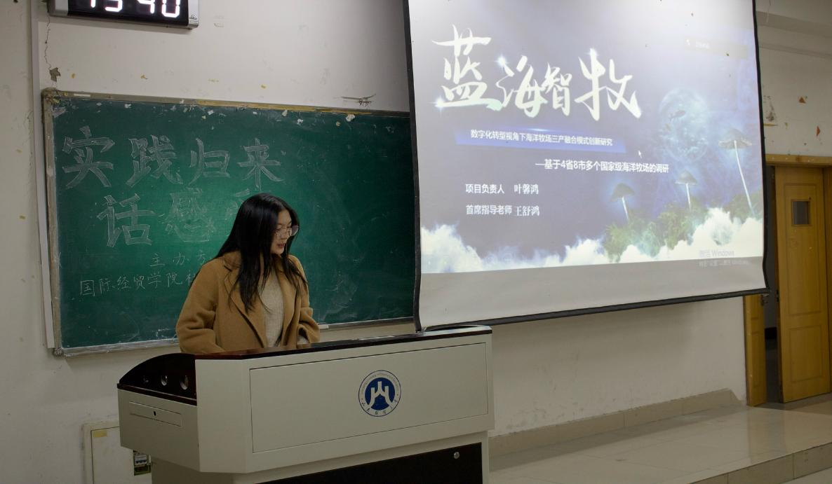 “蓝海智牧・构建现代化海洋牧场产业体系——从1.0到4.0团队”负责人叶馨鸿,从政策与项目背景、研究框架、调研流程、项目成效、创新点及调研风采等方面,系统介绍了数字化转型视角下海洋牧场三产融合模式创新研究项目,生动诠释了新时代青年扎根专业、服务产业的责任担当。随后,该团队第二负责人吴振博分享了个人参与“三千计划”的真切感悟,他鼓励同学们勇于突破自我、主动投身实践,在知行合一中绽放青春光彩,真挚的话语引发在场同学强烈共鸣。