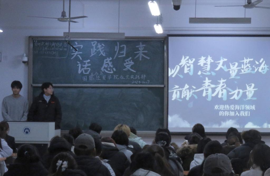 “蓝海智牧・构建现代化海洋牧场产业体系——从1.0到4.0团队”负责人田加兴,从团队创立初衷、发展历程、成果与展望等方面详细地介绍了团队从诞生到壮大的历程,诠释了新时代青年扎根专业、服务产业的责任担当。团队另一位负责人马英航则聚焦团队经历与成员协作,通过具体事例向同学们展现了一个温暖而有凝聚力、专业而富有活力的团队形象。两位负责人的精彩分享,让在场学生对实践团队的组建与运营有了更直观的认识。