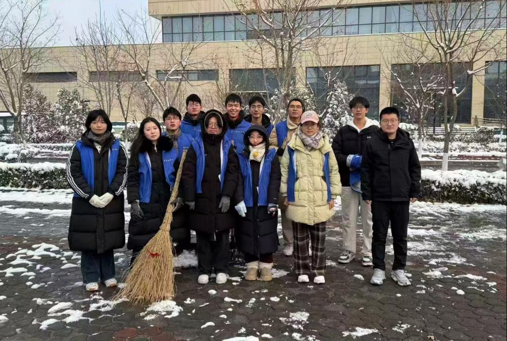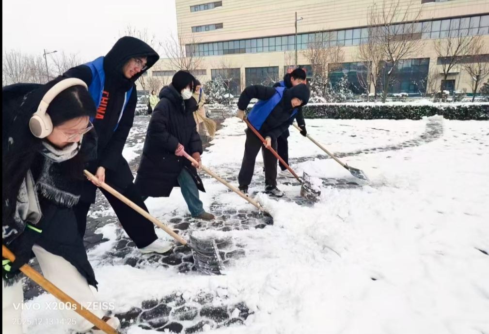 章丘校区的志愿者们于13日下午,手持雪铲、扫帚等工具,分工有序、配合默契,对负责区域进行清理。经过通力协作,教学楼前积雪被有效清除,路面恢复安全畅通。