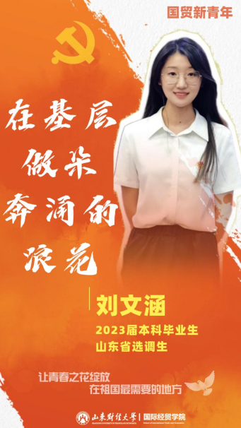 贸易经济专业2023届本科毕业生,山东省选调生。曾获山东省优秀毕业生、第十七届“挑战杯”山东省大学生课外学术科技作品竞赛三等奖、山东省大中专学生志愿者暑期“三下乡”社会实践活动优秀学生、山东财经大学优秀共青团员、山东财经大学优秀学生干部等荣誉。