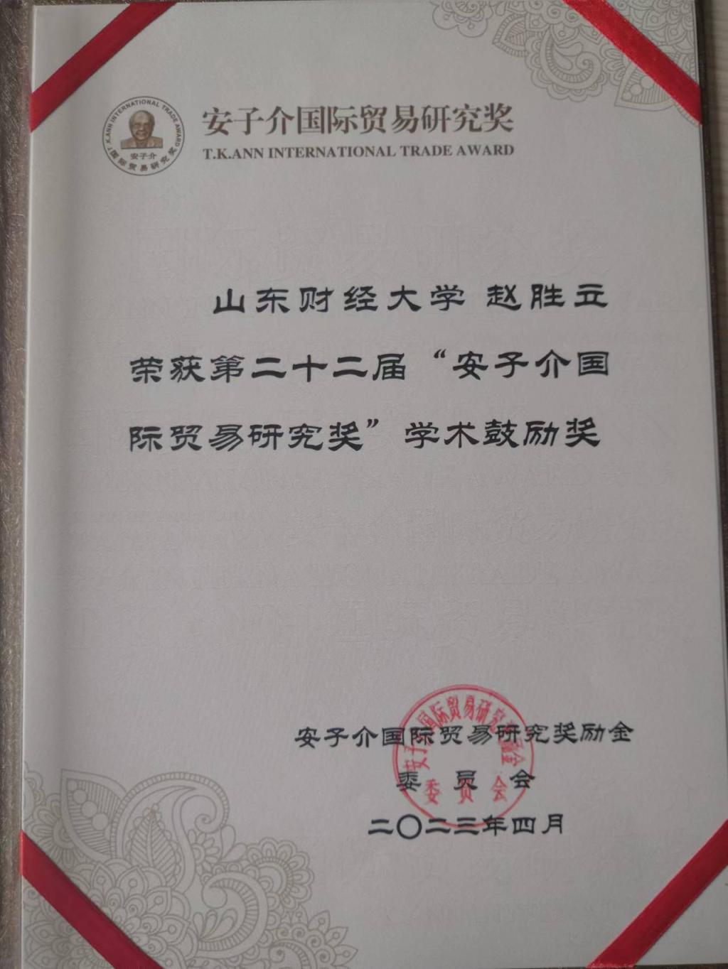 青年教师赵胜立获得学术鼓励奖,该项成果为赵胜立在山东财经大学攻读博士学位期间申报获得。