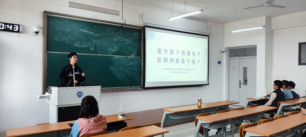 王钰骏同学作为国际发展合作创新班的班长,不仅在学业上取得了优异的成绩,还成功跨专业保研到了西南政法大学的法律硕士专业。他结合自己的学习经历,为新生们详细介绍了保研的准备工作和注意事项,包括如何选择合适的保研方向、如何制定科学的学习计划、如何参加科研项目和学术竞赛等。同时,他还分享了大学生活中的点滴经验,鼓励新生们要珍惜大学时光,积极参加各类活动和社团,拓展自己的兴趣爱好和社交圈子。
