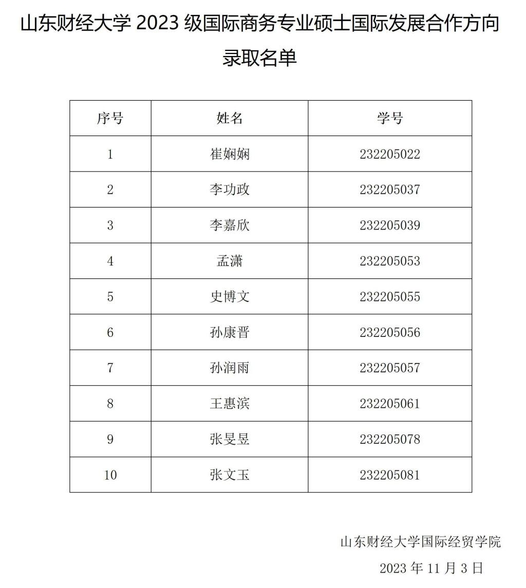 山东财经大学2023级国际商务专业硕士国际发展合方向录取名单