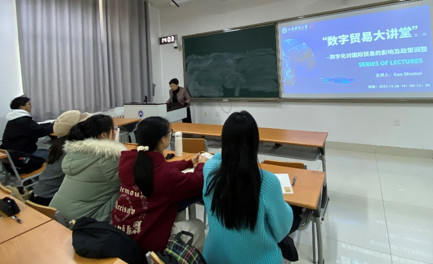 讲座中,Gao Shumei(高树梅)教授详细介绍了当今数字贸易的发展趋势、发展特点、数字贸易规则的演进和特征,在此基础上,剖析了数字贸易对于传统贸易带来的冲击与挑战,并提出了数字贸易背景下各国贸易政策的调整方向和调整战略。讲座后,同学们就数字贸易内涵和外延的界定、中国电商平台在海外崛起等问题,与Gao Shumei(高树梅)老师进行了深层次探讨。