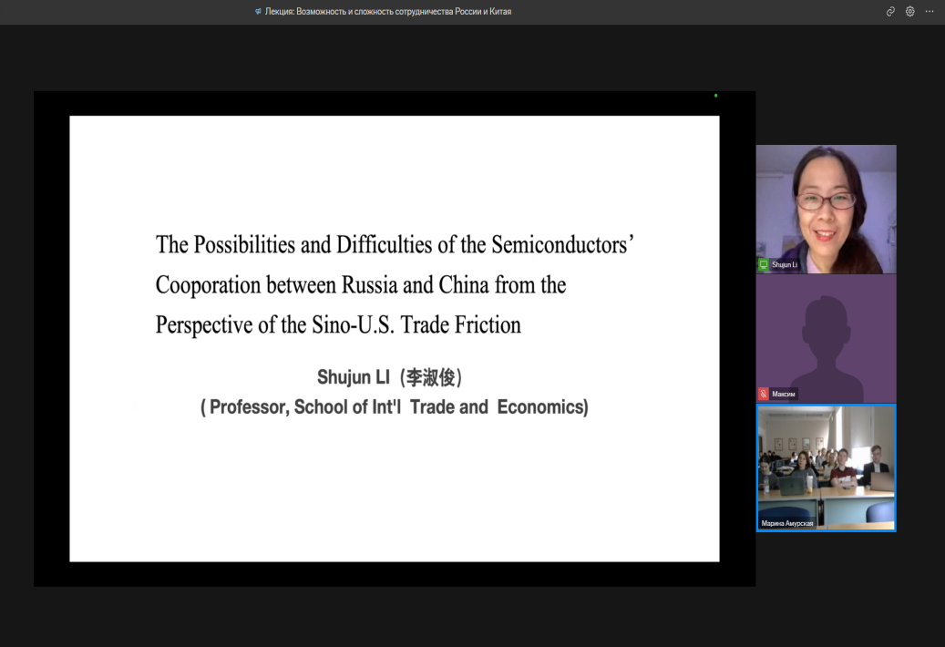 李淑俊教授受邀为俄罗斯联邦政府财政金融大学(俄财大)国际经济关系学院师生开展了一场题为《The Possiblity and Difficulty of the Semiconductors' Cooporation between Russia and China in the Perspective of Sino-U.S.Trade Friction》的讲座。此次讲座主要围绕中美经贸摩擦背景下,中俄两国在半导体产业进行合作的可能性和落地障碍。本次讲座采取线上的方式,由俄财大国际经济关系学院副院长玛丽娜教授主持。