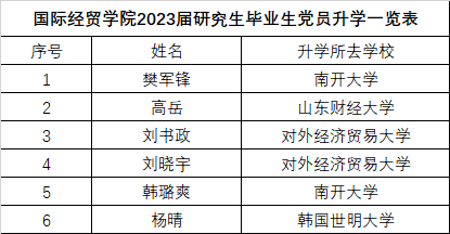 共有11名同学其中支部党员同志6人,分别考入南开大学、对外经贸大学、北京师范大学、首都经贸大学、韩国世明大学、山东财经大学等国内外知名高校继续深造,录取人数和成功率均创历史新高。这既是学院研究生教育教学成果的直接体现,也从侧面反映着研究生党支部“党建+业务”双融合双提升带动工作的成效。