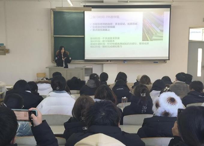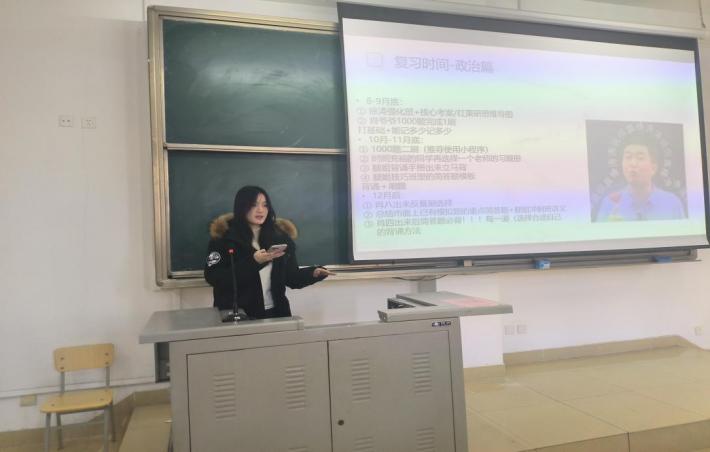 李铭就考研的目的、意义和当前形势展开,鼓励同学们能够继续学习,为争取更好的职业和人生规划打下基础。接着他从初试科目、专业院校、复习规划三方面介绍了在考研过程中如何搜集各类信息和如何结合自身实际情况确定目标院校,提出了前中后期的各学科复习计划建议。李铭同学以自身在备考过程中的心态变化和情绪调节方式为例,鼓励同学们克服焦虑情绪、找到适合自身的放松方式并及时与辅导员老师沟通交流,号召大家尽量以轻松且高效的学习方式投入到考研复习过程当中。另外,她还提到,一旦下定决心要成为一名研究生,就必须付出勤奋努力、脚踏实地,争取一战上岸、学有所成。
