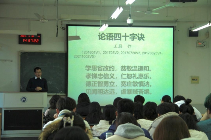 王蔚教授就对《论语》的研究体会总结出论语四十字诀:“学思省改约,恭敬温谦和。孝悌忠信义,仁恕礼惠乐。德正智勇立,宽庄敏慎讷。见闻明达远,虐暴贼吝绝”。王教授带领大家朗读并背诵了四十字诀,希望能够大家能够学会其中修身处世的道理。